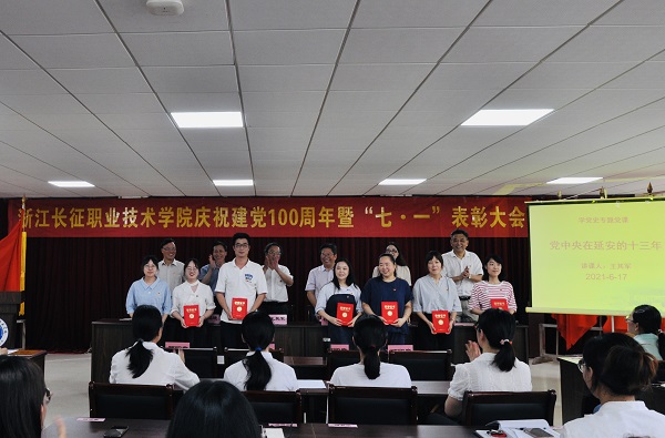 大会在庄严的国歌声中拉开帷幕。首先,吴有恩宣读了《中共浙江长征职业技术学院委会关于表彰2020年度先进基层党组织、优秀共产党员、优秀党务工作者的决定》,并由校领导依次为受表彰的同志颁奖。接着,大会对我校在“学习强国”平台主题学习活动中获奖的个人进行了表彰。优秀共产党员代表金晶及优秀党务工作者代表贺潇分别上台,从各自的角度对此次获奖发表感言,表达了将把此次获奖当成组织的鼓舞和鞭策,当成新的开始,在今后的教学管理和工作生活中积极践行优秀党员责任和使命、更充分地发挥先锋模范作用的决心。